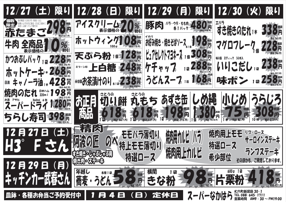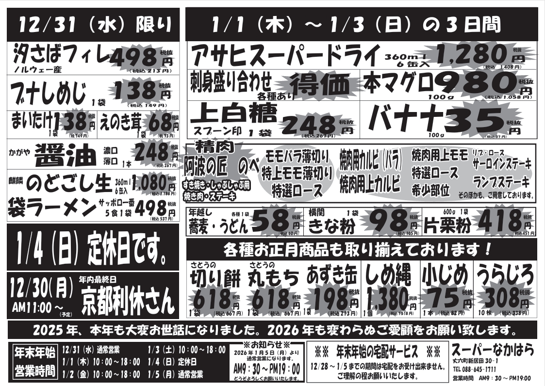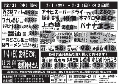 1月 4日(日) 店休日 ※配達もお休みになります。